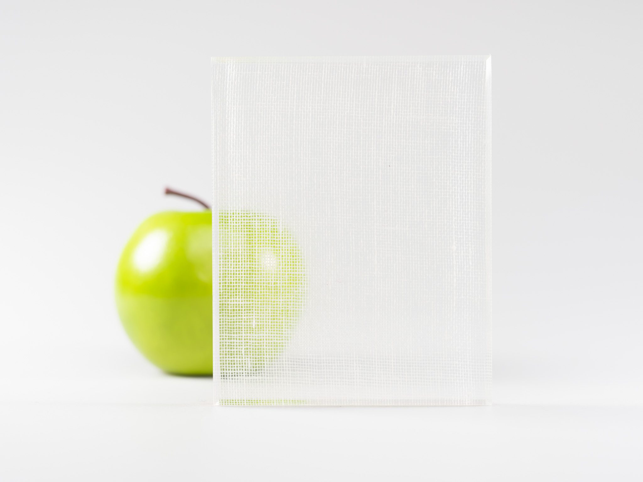 Square-patterned glass with a white wispy gauze-like transparent polyester interlayer to provide muted light transmittance and medium opacity. A double-sided solution, this product is ideal for white partition walls and doors.