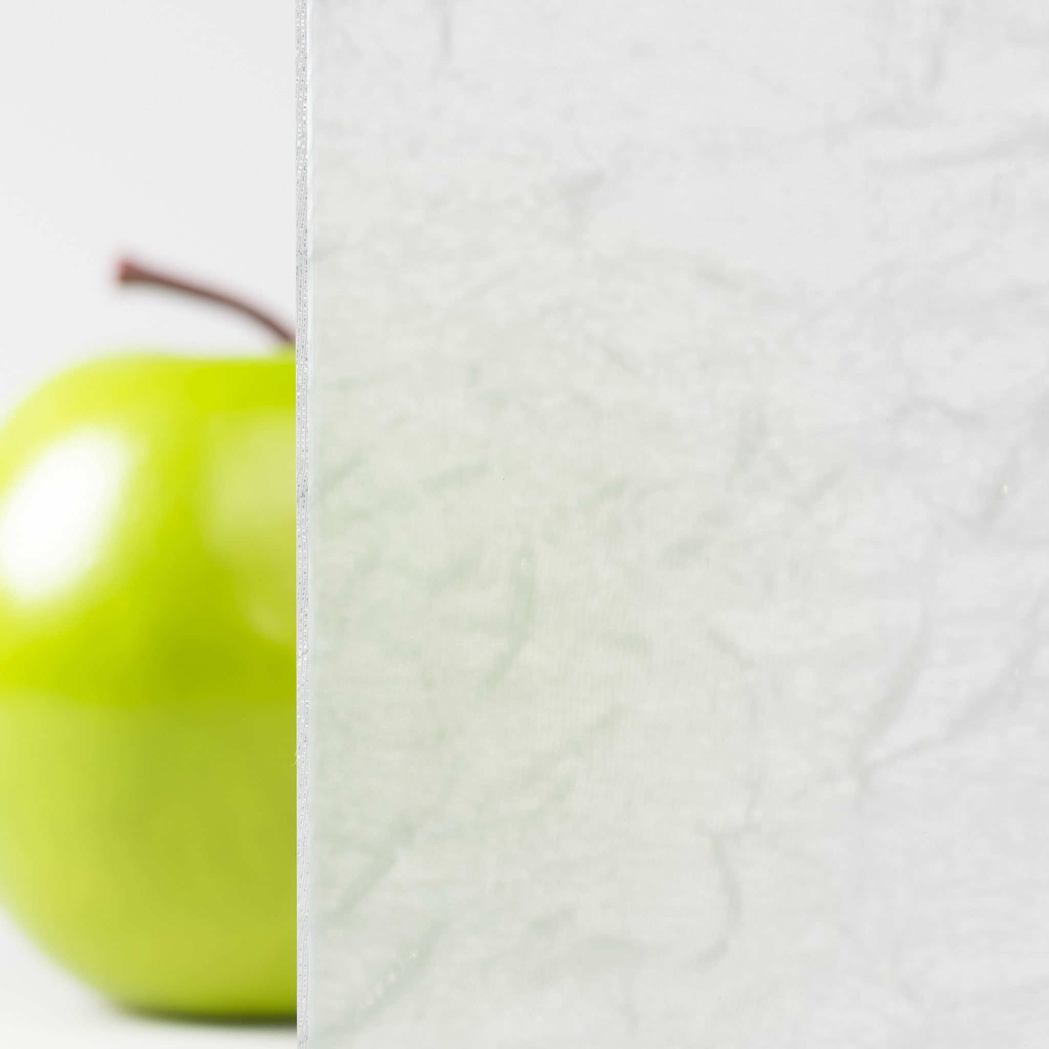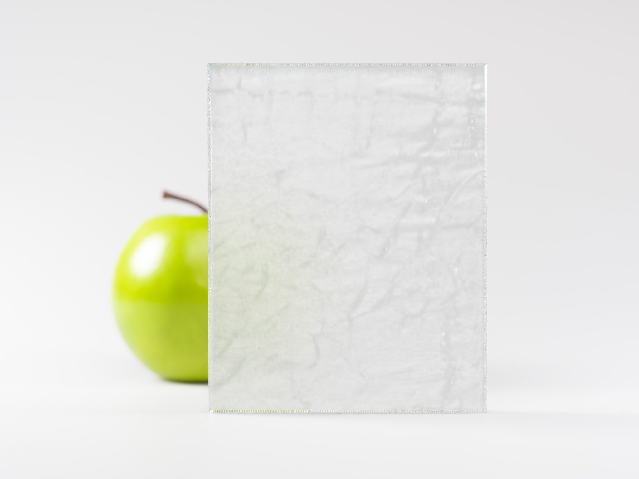 Featuring both a textured wrinkled glass layer, as well as a frosted glass element, this double-sided glass offers medium translucency with a neutral color.