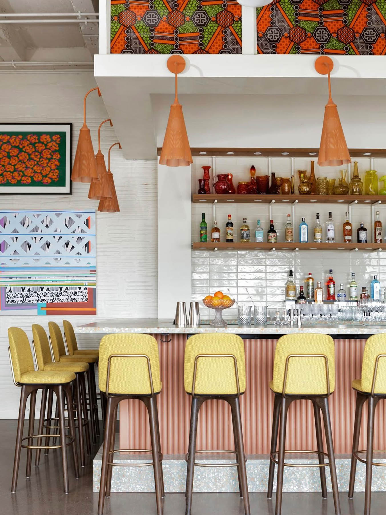 The backlit fabric glass contributes perfectly to the playful mix and breezy vibe of this rooftop space.