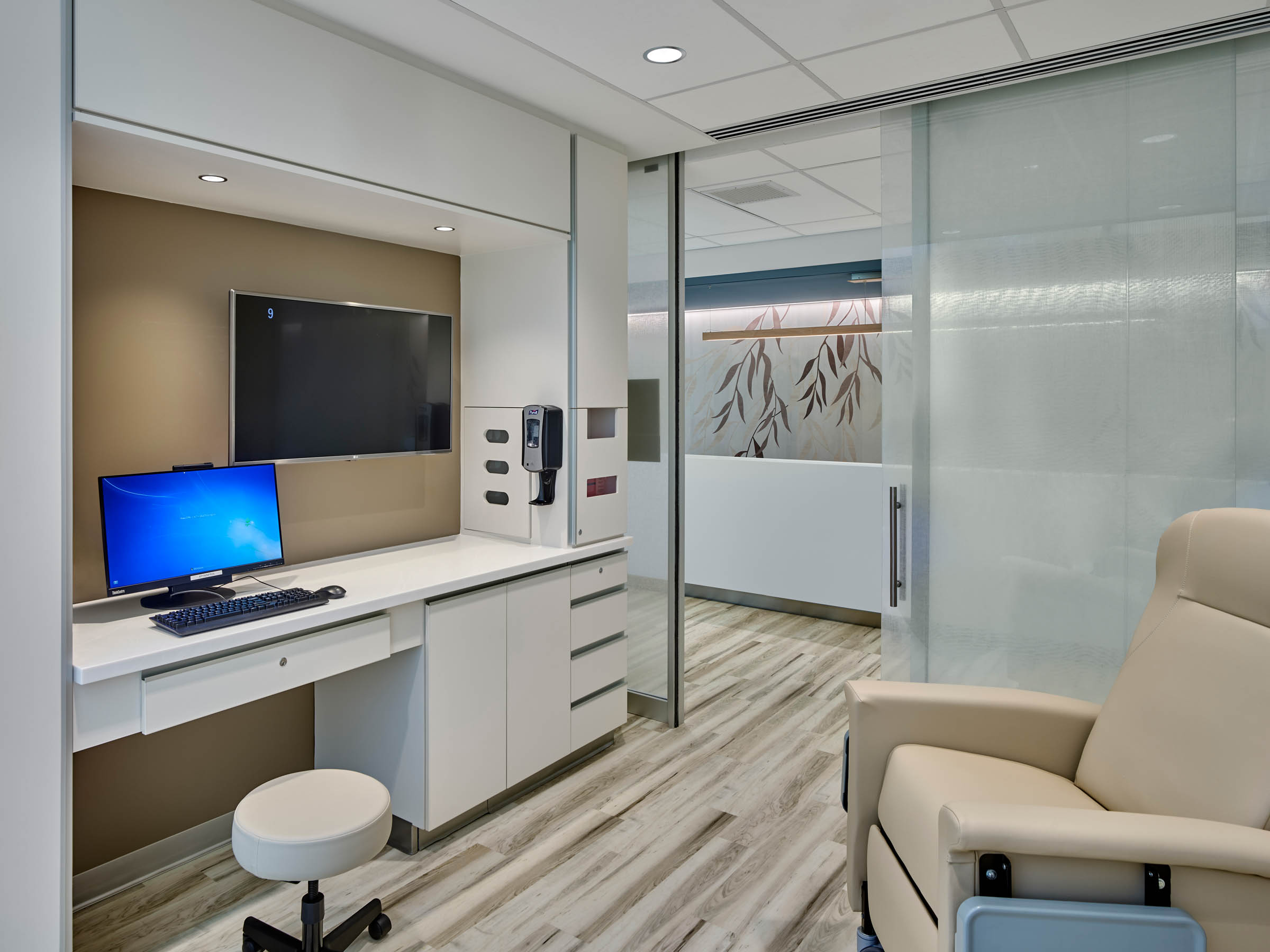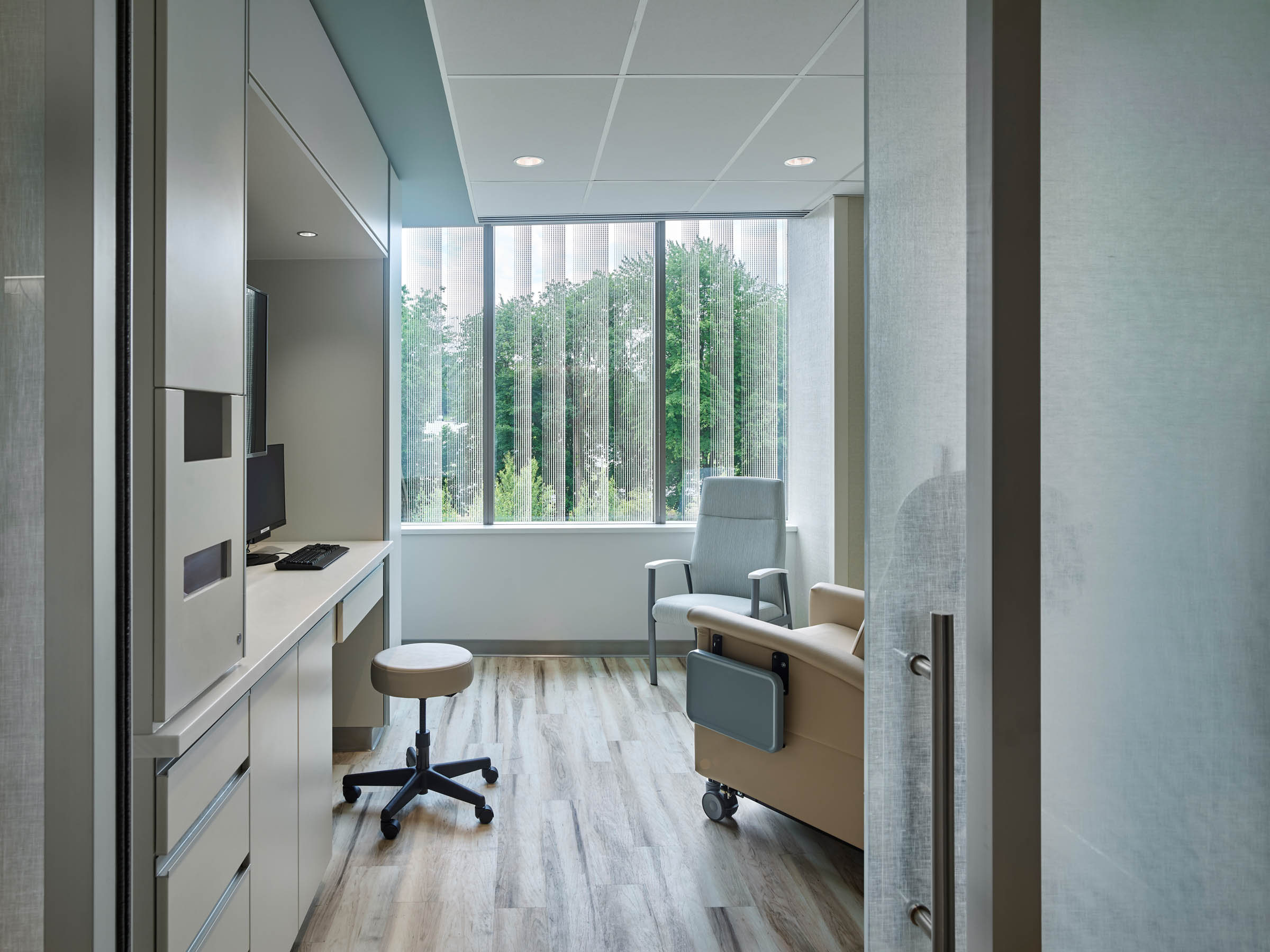 Archetype provided fabric glass panels that serve as partitions and doors in multiple areas of the building. The classic and timeless look of this product is often specified for healthcare settings as it gives a hushed feeling and a comforting veil of privacy for patients and their families.