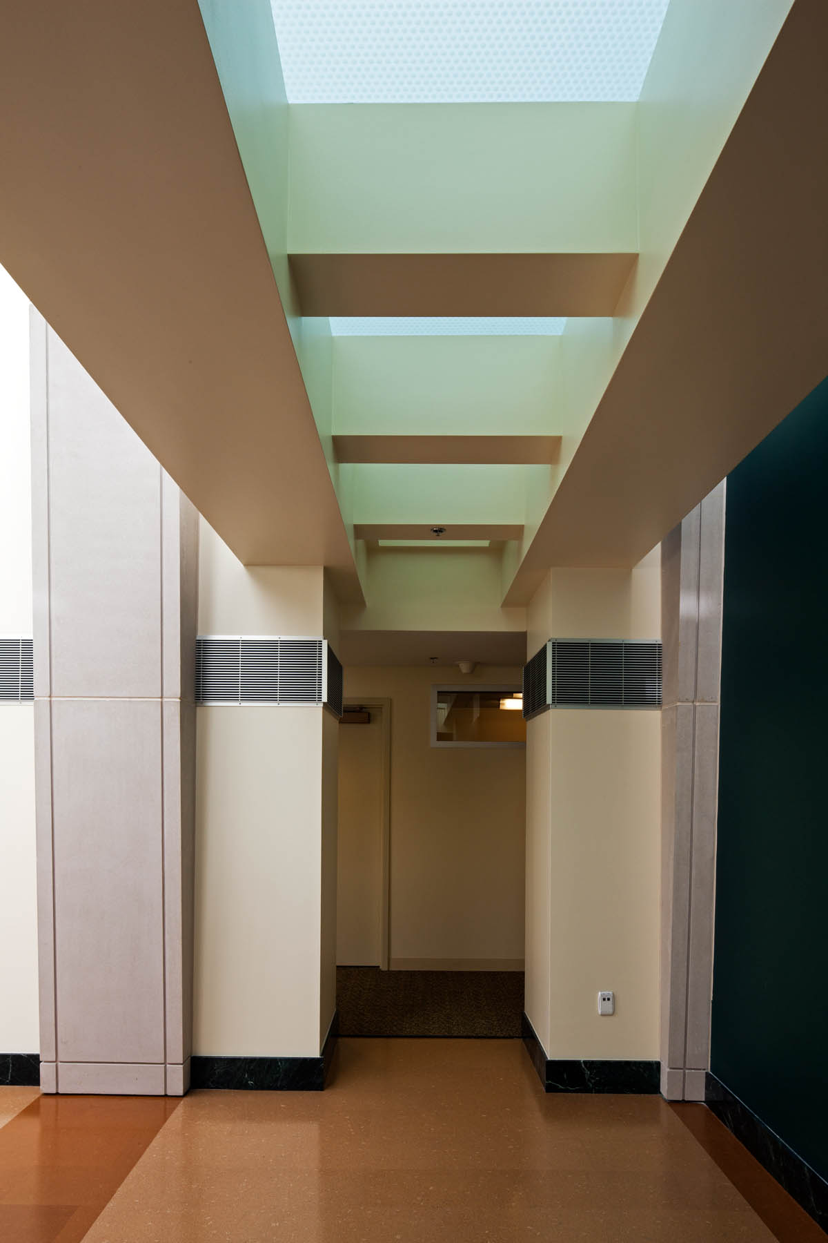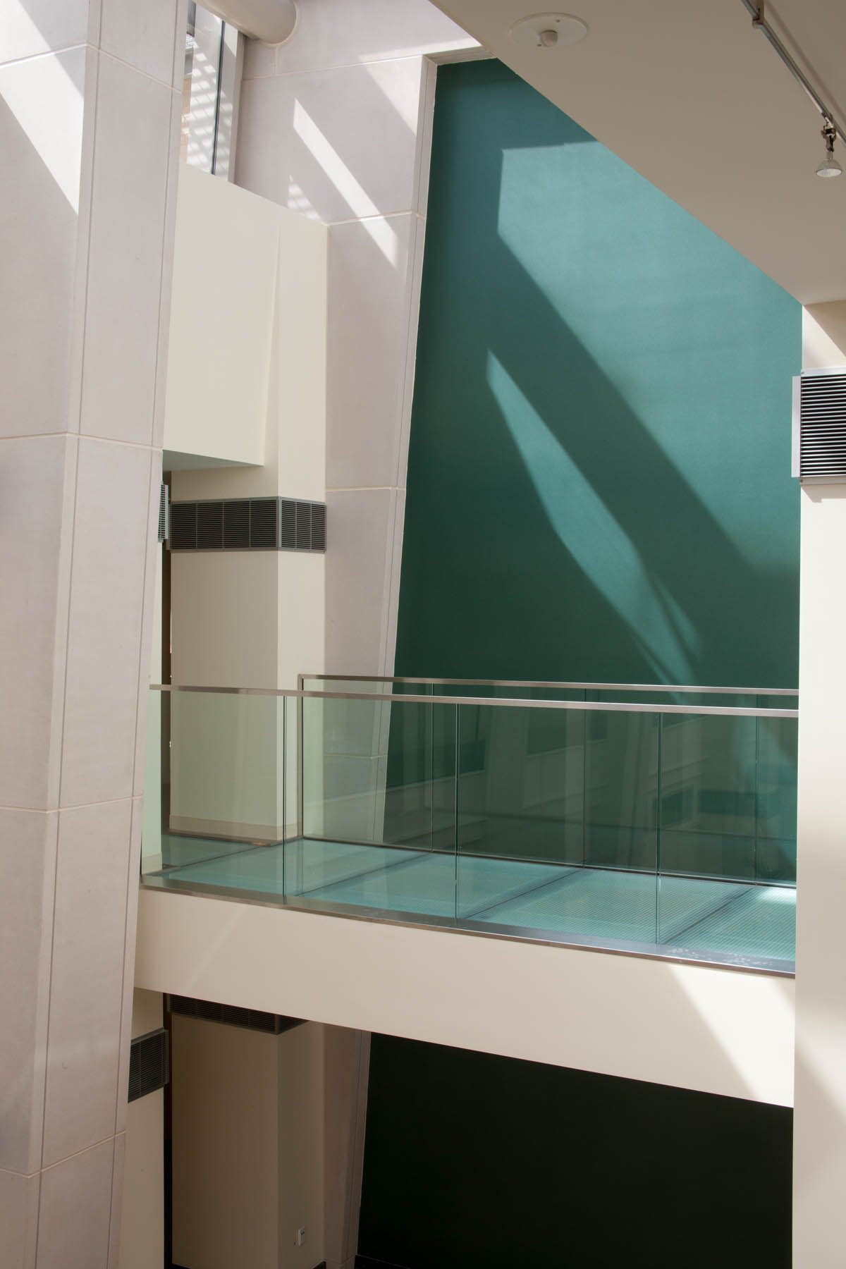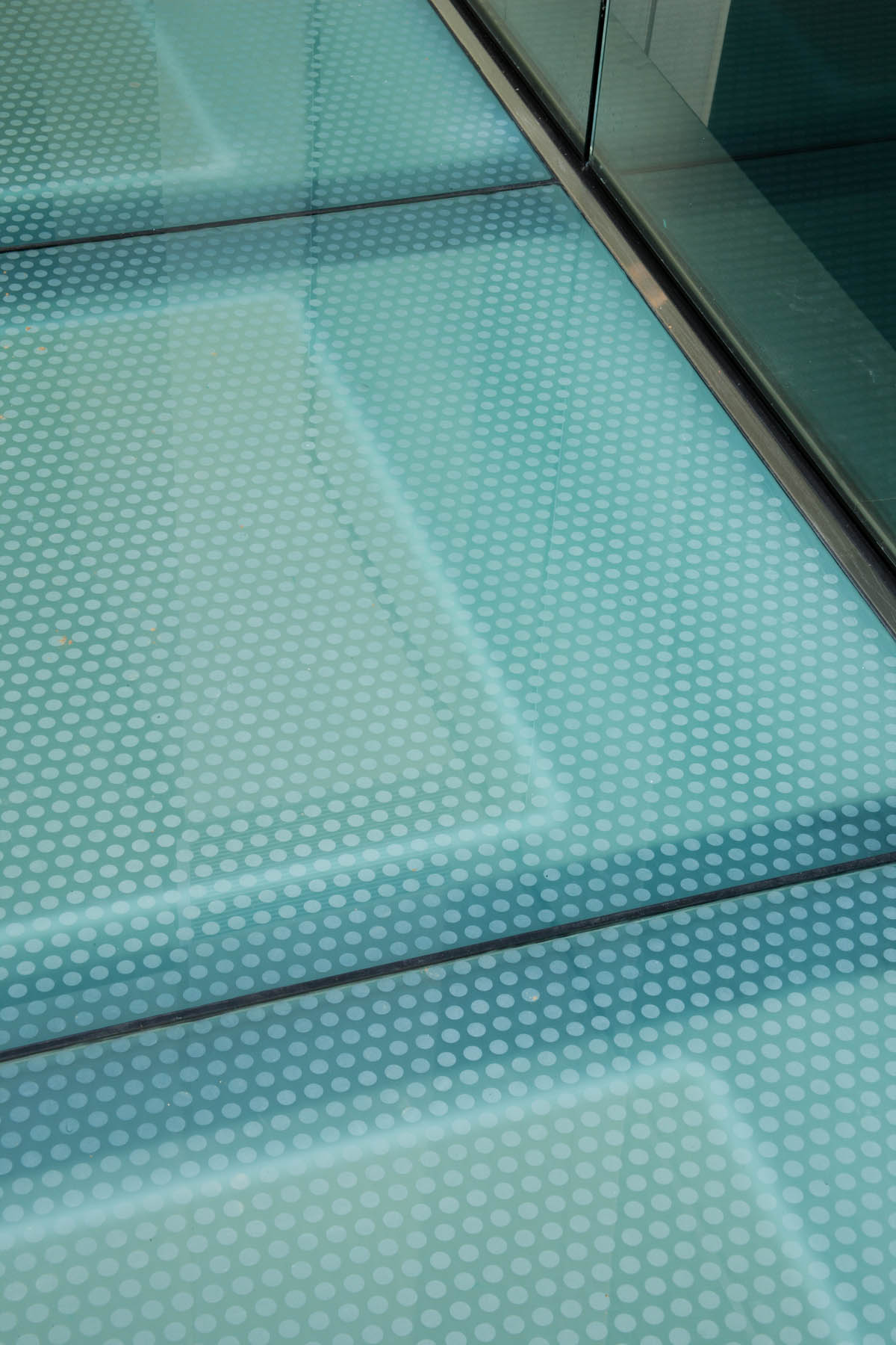 The construction of this glass bridge called for triple-layer laminated glass with all layers being tempered, and customized opacity in the interlayer. By adding a surface-etched dot pattern, Archetype achieved a non-slip finish.