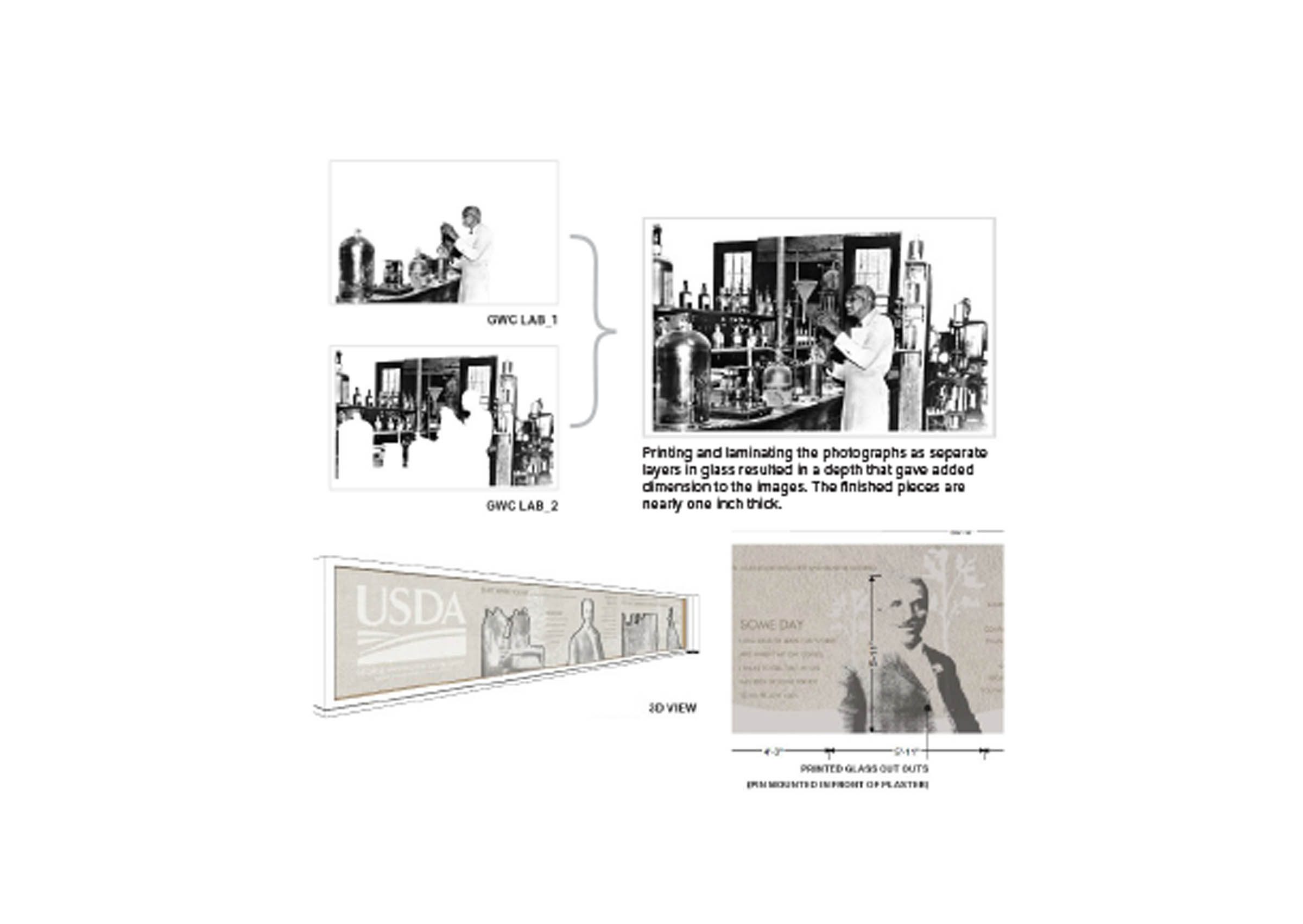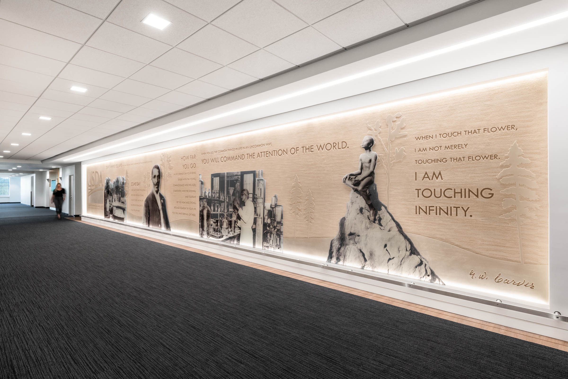 Archetype worked through several rounds of development in creating the photographic silhouettes for this floor-to-ceiling installation, resulting in a compelling storyline mural that highlights the lasting contributions of George Washington Carver’s work in the field of agricultural research.