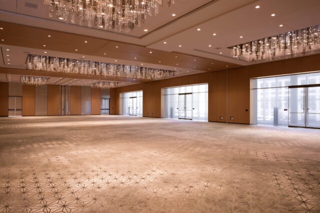 Archetype provided laminated glass partition walls with a custom fabric interlayer that serve as a semi-private divider between a meeting area and the surrounding space. This same product was used throughout the event spaces as well, in both walls and doors.