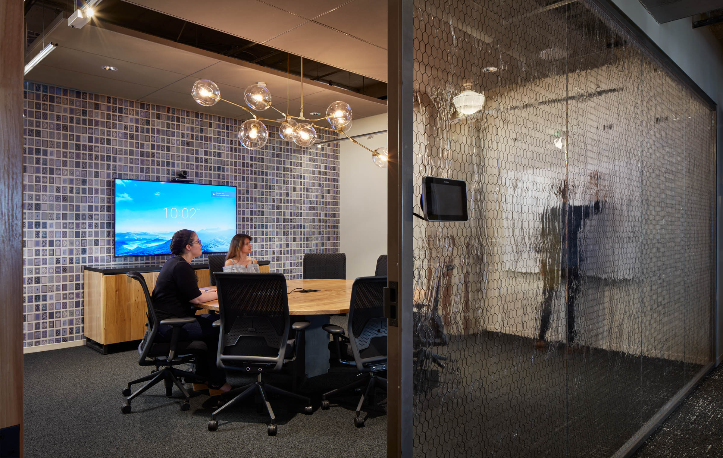 This client asked Archetype to capture the look of chickenwire with a printed graphic, and added a textured art glass to soften the industrial look and obscure the view from both sides of the partition.