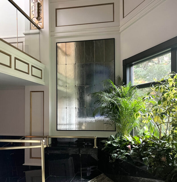 Two different styles of Archetype mirror were specified for areas of the luxurious Nemacolin Resort. The textured surface decorative mirror was fabricated in uniform panels and installed individually to create a custom feature wall for an entrance lobby. The hand-rolled art glass surface gives the natural light a soft place to land and illuminate the architecture and rich greenery.